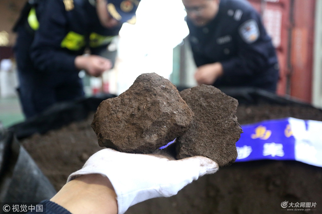 2018年5月22日, 青岛海关关员展示查获走私的固体废物。