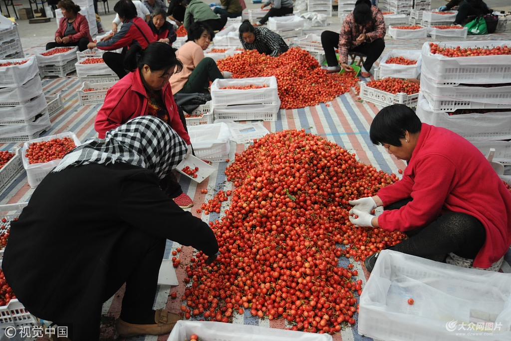 2018年5月23日, 在山东烟台福山区张格庄镇大樱桃批发市场,农民分拣大樱桃准备外销 。