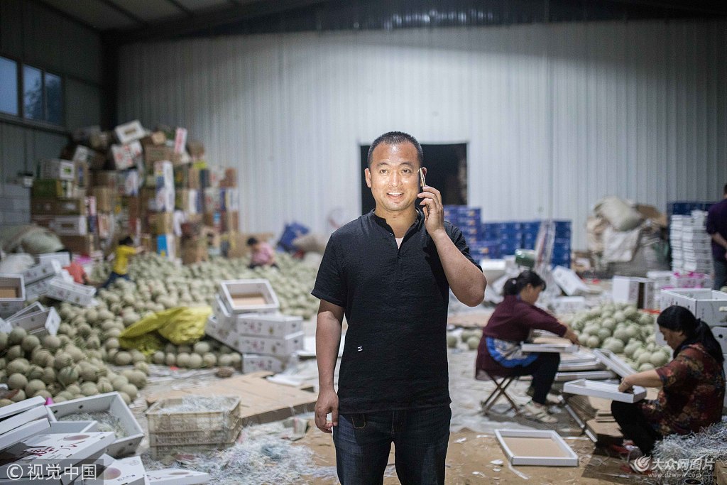 2018年5月25日,山东省莘县魏庄镇东江店村,恰逢网纹瓜上市,李金冰和当地果农每天都忙着采摘和销售网纹瓜。图片作者:锐图-许康平/视觉中国