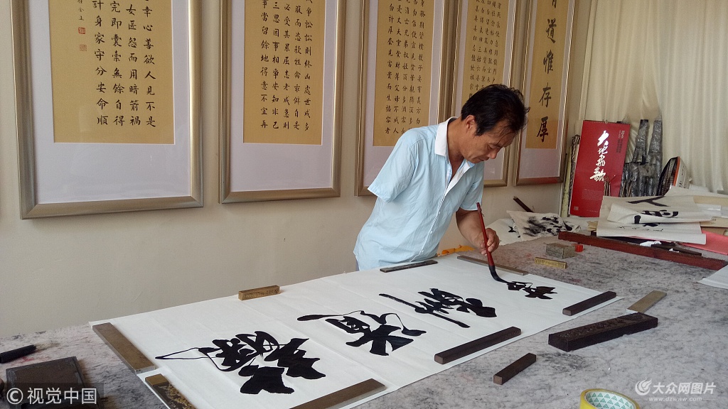 “忽而惆怅,独坐书桌,低头沉思,奔向何方。夜有明灯,路有千条,选择书道,为我航标。”这一段话是莒县农民书法家仕金正在 36年前失去右臂后写出的,他用这段话鼓励自己用左手练习书法。从强忍着右臂伤口的疼痛写铅笔字,到挥毫泼墨写唐楷,他这一写就是36个春秋。