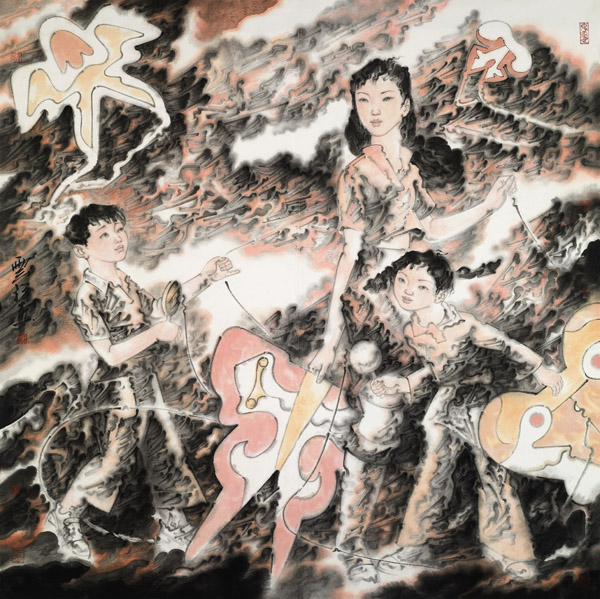 中国传统壁画运用了大量的色块来衬托人物,薛云祥先生将风筝的色彩融入水墨画的想法奠定了基础,在这以后,风筝与人成为薛云祥画作中重要的元素。