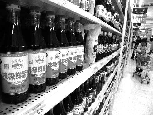 超市里正在销售的烟台山牌味极鲜酱油。本报记者鞠平摄