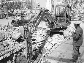 在西大街和大海阳路的交叉路口,记者看到,两辆橘黄色的挖掘机正进行挖掘作业,旁边的施工人员不断地打着手势,并大声叫着:向左,再向左一点……挖掘机的铲子不时的挖起一铲子土,然后堆放在路的另一边。