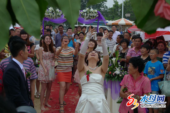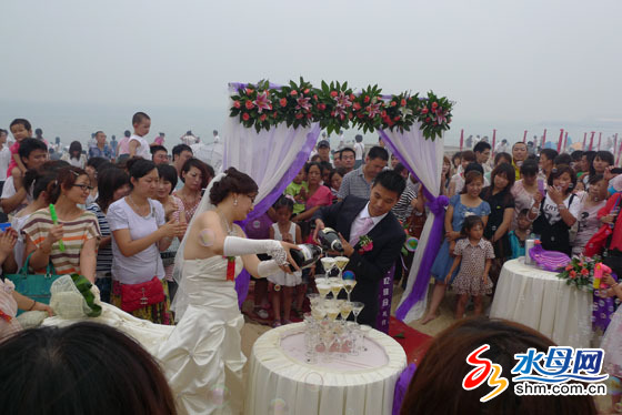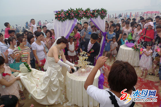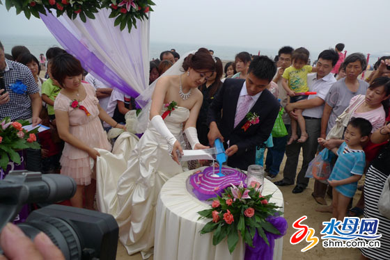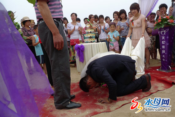 浪漫的户外婚礼吸引了许多市民和游客。来自牟平区的新郎王力和新娘王艳妮在沙滩上临时搭起的花棚前交换信物,跪拜天地、父母双亲。