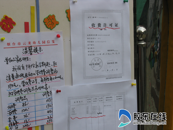 在云龙幼儿园内的公告栏里,左边的是收费调整通知,右边为物价局核准文件