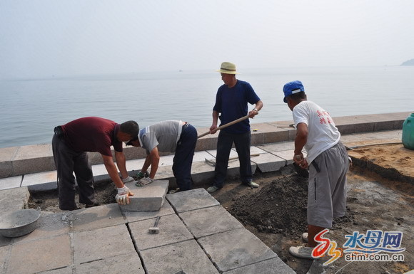时间:早晨10点;地点:海韵广场。这边是负责清理淤泥的挖掘机来来回回忙个不停,那边是工人们忙着砌石板。