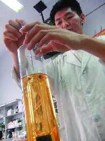 这些“三无”扎啤口感与质量如何?随后,记者以1.5元的价格购买了一杯,发现这些扎啤与品牌扎啤相比,泡沫很少,颜色看起来比较暗淡,喝起来缺少那种清爽润口的感觉。为了更好地了解这些无名扎啤的成分含量,记者在市场上随机购买了烟台啤酒扎啤以及“三无”扎啤各一升,带到烟台大学生命科学学院实验室对其酒精度进行了检测。