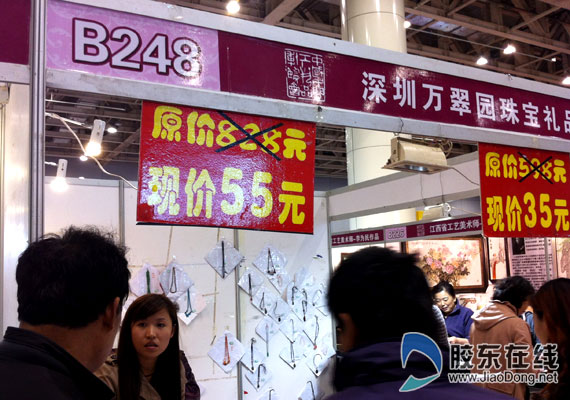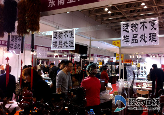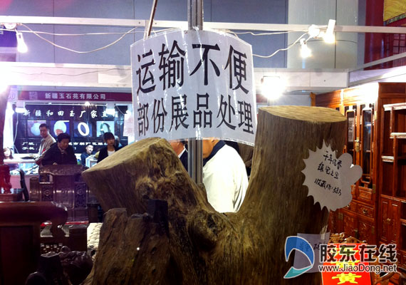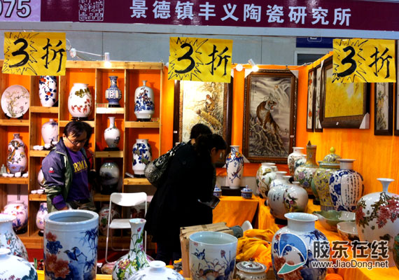 据一根雕展位老板介绍,展会即将结束,他们的货物都是“大家伙”,运输十分不方便,所以打折促销。在B馆陶瓷去,景德镇陶瓷也打出促销招牌,促销幅度也相当诱人。