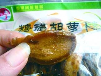 本报11月3日讯(记者 苑菲菲) 酱菜包装上明明写的是糖醋胡萝卜,打开一看里面全是一片一片的姜。厂家解释说,因为姜片包装袋没了,才用胡萝卜袋用于包装,质量绝对没问题。