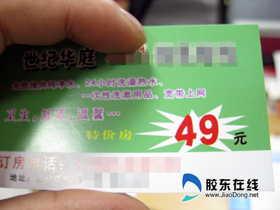 “49元特价房,一次性洗漱用品,宽带上网……”烟台一家民居改造的小旅馆,撵着学生就餐的高峰期,在烟台大学南校区派发小广告。与DM直投广告相比,更多的旅馆采取的是海报促销的方式,在烟台大学随处可见旅馆的优惠开房广告。