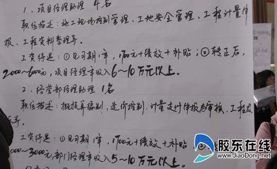 记者从招聘现场了解到,为了招到合适人才,许多企业纷纷将福利待遇在招聘信息上着重指出。在烟台一家建筑公司的招聘信息栏上,标注招项目经理及助理,年薪高达6万到10万元。招聘负责人告诉记者,这个岗位不限制专业,也没有工作经验限制,只要应聘者觉得自己有能力,就可以报名尝试。“而年薪6万以上只是一般的工资,如果有能力的话,可以赚得更多。”