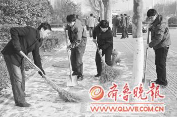 莱山区住建局机关干部及企事业单位职工在迎春大街中段西侧清扫卫生。 本报记者 赵金阳 通讯员 牛立志 摄