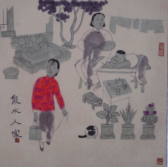 后来,家搬到过历山顶街和县西巷,院里都有口古井。浇花、洗衣、刷碗都在井里打水用。县西巷那口井的内壁上还有两个台阶窟窿。是夏天人们冷藏西瓜或其他食品的地方。那时候没有听说过电冰箱。人们还嫌在家洗衣服洗不干净,都是去青龙桥,或者去鸭子湾(珍池)。后来搬到正觉寺西头,上河涯都是去五州街和东流水(现五龙潭公园)。从前,剪子巷、花墙子街23号门牌前,有个北煮糠泉,泉池南北矩形,后因音讹称为“杜康泉”。其泉水能够涌上路面,石板路的缝隙泉水汩汩涌出,水中常摆着砖头供路人行走。有些妇女穿着胶鞋在这里洗衣裳。“泉水石上流,洗衣不用愁”就是指的这里。杜康泉是附近居民饮水之源,这可谓当时济南一大奇观。