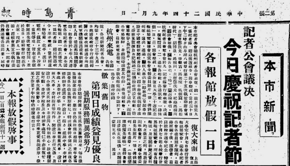 11月8日,整日忙碌的记者、编辑们又将迎来自己的节日———第十一个中国记者节。回眸历史,中国最早的记者节诞生于上世纪30年代。1935年9月1日,在全国庆祝记者节之际,在杭州举办了一次为期7天的全国报纸展览会。这次报纸展览会声势浩大,颇具规模,汇集了全国各城市出版的报纸精华,反映了当时中国新闻出版业的现实状况。旁求博考,青岛当年有4家报纸媒体参加了此次报纸展览会,充分显现了当时青岛报界的实力影响。